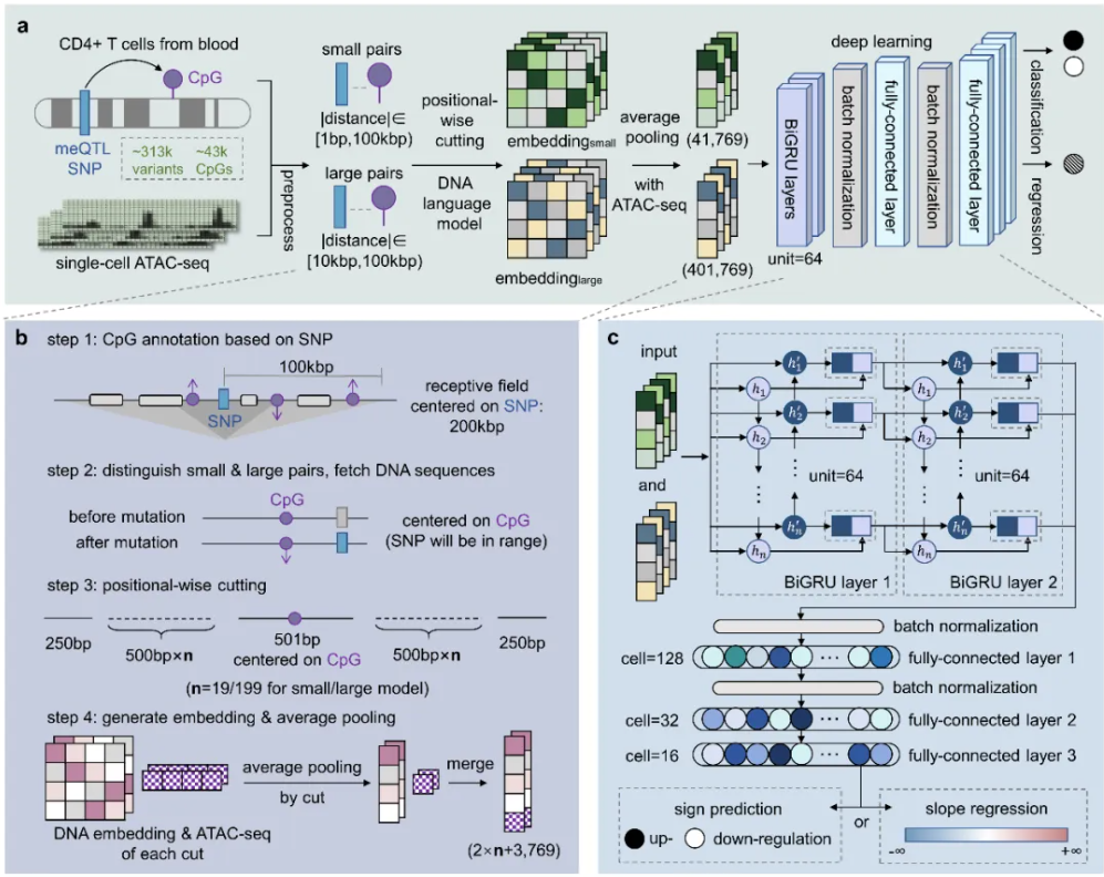 图1 Methven模型架构与预测流程。(a) 使用DNA序列和单细胞ATAC-seq数据预测非编码SNP对DNA甲基化的影响。(b) 预处理流程示意图。(c) 深度学习模块细节。