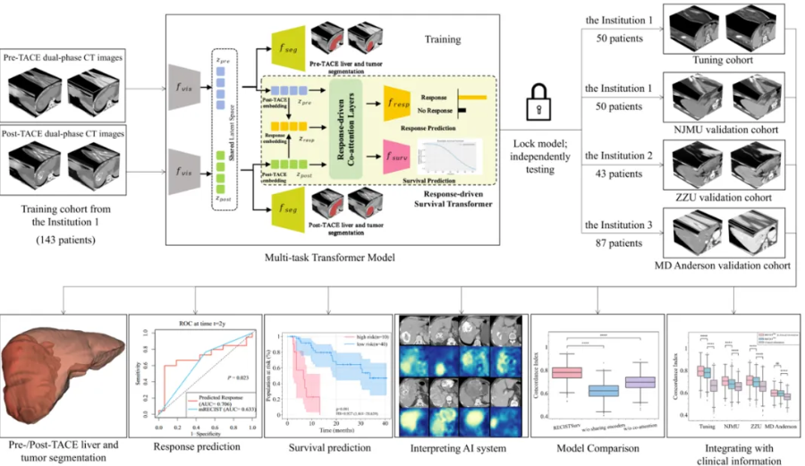2025年7月10日,国际期刊IEEE Transactions on Image Processing (TIP)在线发表了题为“RECISTSurv: Hybrid Multi-Task Transformer for Hepatocellular Carcinoma Response and Survival Evaluation”的研究论文。该期刊是计算机视觉与医学图像分析领域的顶级期刊,专注于图像处理算法的前沿研究及其在医疗、工业等领域的应用。针对肝细胞癌经动脉化疗栓塞(TACE)治疗后预后存在高度异质性的临床难题,上海交通大学研究团队联合上海人工智能实验室、南京医科大学提出RECISTSurv模型,一种基于纵向CT影像的混合多任务Transformer框架。RECISTSurv实现肝脏/肿瘤分割、短期疗效反应预测、长期生存评估的多任务协同学习,并通过反应驱动协同注意力机制(RCA)动态关联治疗前后的影像特征,克服传统单时间点分析的局限性,引导模型聚焦预后关键区域,提升可解释性。RECISTSurv在多中心验证中展现出卓越的泛化能力,生存预测性能显著优于现有方法,且风险评分被证实为独立预后因子。