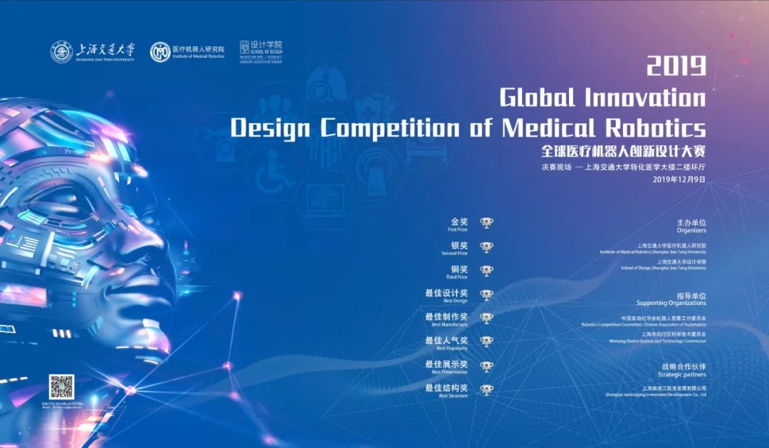 2019年12月9日-11日,全球医疗机器人创新设计大赛决赛在上海交通大学转化医学大楼成功举办。大赛由上海交通大学医疗机器人研究院和设计学院主办,由上海市闵行区科学技术委员会和中国自动化学会机器人竞赛工作委员指导,与上海南滨江投资发展有限公司战略合作。旨在发掘技术先进、设计新颖的优秀作品,并为这些作品提供进一步培育和产业转化的机会。全球医疗机器人大赛前期吸引了来自中国、新加坡、美国、意大利等国家共53个队伍,260多名选手参赛,通过预选赛最终遴选出11支队伍进入总决赛。