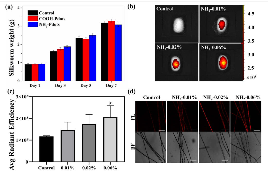 该研究成果以“Dual-Performance Optimized Silks from Ultra-Low Dose Polymer Dots Feeding and Its Absorption, Distribution and Excretion in the Silkworms”为题发表在高起点SCIE新刊《Advanced Fiber Materials》上。上海交通大学六合宝典 博士生李婧茹为本文第一作者,熊丽琴长聘副教授为通讯作者。