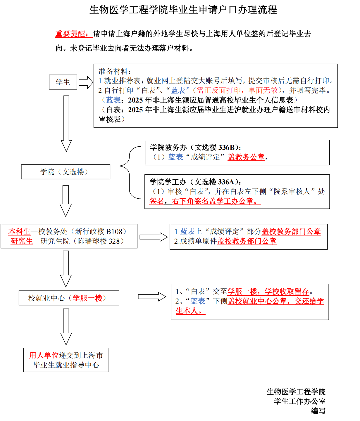 根据上海市教育委员会、上海市发展和改革委员会、上海市人力资源和社会保障局和上海市公安局联合发布的《关于做好2025年非上海生源应届普通高校毕业生进沪就业工作的通知》的文件精神,现将落户材料的校内办理流程整理如下,供同学们参考。流程详解、材料填写模板可参考: //docs.qq.com/sheet/DQWtCY1N0V1dWaE91?tab=BB08J2