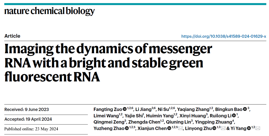 针对以上问题,上海交通大学朱麟勇团队从荧光成像技术的核心——荧光染料设计——出发,基于染料结构设计解决RNA成像荧光亮度低和光稳定性差的问题,从而实现RNA的长时间动态追踪。该技术有望为活细胞层面RNA的长时间成像和动态追踪提供技术支撑,推动对RNA参与生理过程的认知。相关成果以“Imaging the dynamics of messenger RNA with a bright and stable green fluorescent RNA”发表于《Nature Chemical Biology》。论文第一作者为左方婷博士、蒋丽博士和苏倪博士。通讯作者为陈显军教授、朱麟勇教授和杨弋教授。这是该研究团队继去年九月份在《Nature Methods》期刊上报道荧光RNA成像技术以来的又一个突破性进展。