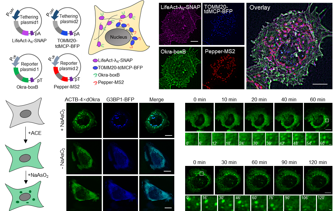 基于该探针具备的高荧光亮度和强光稳定性,研究团队探究将其用于RNA超分辨荧光成像方面的研究。通过将该探针与团队之前报道的红色荧光RNA联合使用,成功实现了活细胞中两个mRNA的双色超分辨荧光成像。此外,为了进一步展示该类探针在长时间RNA动态追踪方面的优势,团队将其用于成像哺乳动物细胞内应激颗粒的形成及解聚过程,并成功观察到应激颗粒的产生以及由小到大的融合过程,成功揭示了ATP能量对应激颗粒的形成、运输和解聚过的重要性(图2)。
