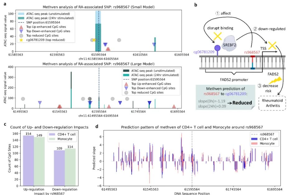 Methven的应用前景广泛,不仅在基础研究中具有巨大潜力,更为临床应用提供了可行的解决方案。在精准医学领域,Methven能够根据个体的基因组特征和细胞类型特异性甲基化模式,为其量身定制治疗方案。例如,研究团队在类风湿性关节炎的研究中,Methven通过分析与疾病相关的非编码单核苷酸多态性(SNP),发现了特定的CpG位点在患者和健康个体中的甲基化变化。通过对患者的SNP、甲基化水平以及其他表观遗传特征的综合分析,Methven能够在疾病发生的早期阶段提供风险预测,帮助医生更好地制定个性化治疗计划。