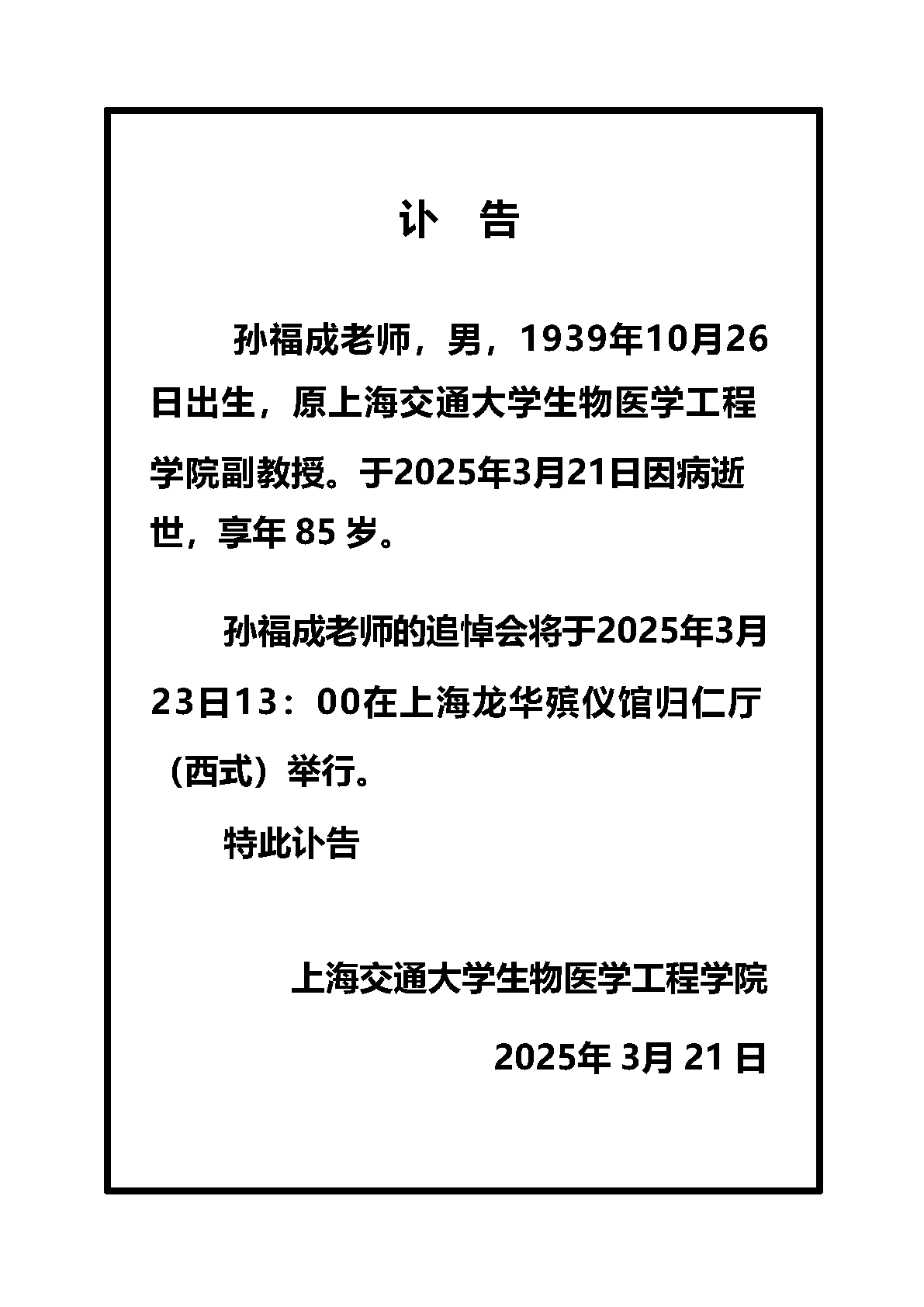 孙福成,男,汉族,1939年10月生,江苏常州人。原上海交通大学生命科学技术学院生物医学工程系副教授。1999年10月退休。