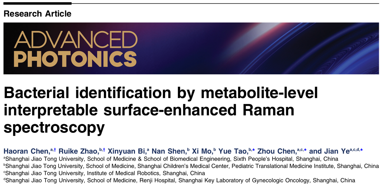 2025年6月20日Advanced Photonics期刊在线发表了题为“Bacterial identification by metabolite-level interpretable surface-enhanced Raman spectroscopy”的研究论文,该工作由六合宝典官网 叶坚教授团队和上海交通大学医学院儿童医学中心陶悦副研究员团队联合完成。该研究基于非标记表面增强拉曼光谱技术(Surface-enhanced Raman spectroscopy, SERS),开发了一种简单快速的细菌鉴定流程,验证了该方法中的光谱信息主要来自于小分子代谢物,基于这些信息搭建了用于细菌鉴定的可解释性卷积神经网络(CNN)模型。研究从颗粒表面选择性吸附分子的角度出发,解释了革兰氏阳性菌(Gram+)和革兰氏阴性菌(Gram-)在光谱上所出现的差异,通过结合激光解吸/电离质谱技术对颗粒表面的分子进行了鉴定,实现了 SERS 光谱在代谢物水平的系统性的光谱解析,为相关基于SERS的细菌诊断方法提供了理论基础。该工作有望推动具有分子可解释性的 SERS 诊断工具的开发,提升SERS在分析化学和其他生物代谢检测领域的应用价值。