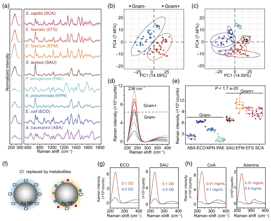 细菌感染已构成全球性公共卫生领域的重大威胁,尤其在 COVID-19 大流行之后,与细菌感染相关的疾病发生率显著攀升。无标记的光谱检测技术,能够通过测量细菌对光的吸收或散射特性,得到可用于细菌鉴定的独特生物光谱。表面增强拉曼光谱(Surface-Enhanced Raman Spectroscopy, SERS)是一种高灵敏的指纹式分子检测技术,具有快速、操作简单、设备成本低且仪器小型化的特点,在环境以及临床病原菌鉴定等场景中展示出了强大的应用潜力。目前,尽管包括SERS在内的光谱技术展现出了显著的优势,但仍存在关键问题没有解决,限制了其发展和应用。聚合酶链式反应(PCR)、二代测序(NGS)以及基质辅助激光解吸电离(MALDI)技术能够针对细菌特异的基因或者肽段进行诊断,然而与这些技术相比,现有无标记 SERS 检测方法缺乏可解释性。SERS光谱如何反映细菌间的差异,以及复杂的指纹光谱反映了哪些信息尚不可知,这要求从分子层面针对光谱数据进行详细的解析,而不是仅限于当前领域内常用的文献比对或理论经验等方式。