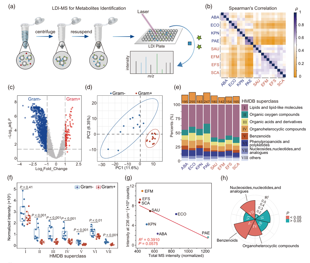 虽然该鉴定方法得到了较高的准确性,但是解释基于SERS的细菌鉴定方法的内在机制也很重要。SERS的特点认为靠近颗粒表面的分子更容易被信号增强,这些分子贡献了主要的SERS光谱特征。结合前述颗粒表面Cl-吸附的差异性,作者使用激光解吸电离质谱(LDI-MS)技术对吸附了细菌代谢物的颗粒表面进行了详细的分析。结果表明,SERS光谱的差异和颗粒表面分子的差异具有一致性。颗粒表面代谢物的量和SERS光谱中Ag-Cl键的强度具有负相关性,且核苷类、含苯环类、有机杂环类化合物的负相关性更强,这与作者通过实验数据和文献验证SERS光谱所匹配的代谢物是相符的。同时这也验证了前面的推测,即Gram-菌释放了更多的代谢物取代颗粒表面的Cl-离子。