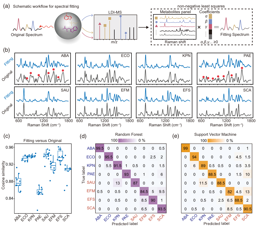 在本研究中,作者基于实验现象与表面化学分析,系统验证了表面增强拉曼光谱(SERS)技术用于细菌鉴定的内在作用机制,建立了表面增强拉曼光谱的一套在分子水平可解释的分析流程。这一成果突破了传统无标记 SERS 技术在细菌鉴定中数据分析的 “黑箱” 瓶颈,通过整合激光解吸/电离质谱与机器学习模型,实现了从光谱特征到代谢物分子的溯源解析。更为重要的是,该方法构建的可解释性分析框架具备普适性,能够为 SERS 技术在细胞等复杂生物样本的代谢检测中提供标准化的分子层面解析路径。