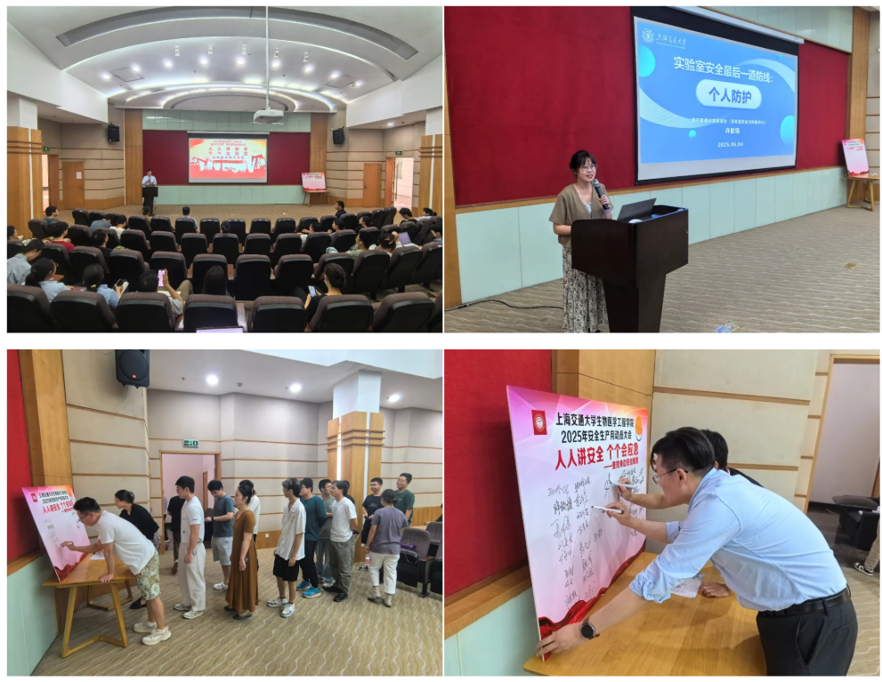 6月4日,学院在闵行校区文选医学楼一楼报告厅隆重召开“安全生产月”动员大会。会议由学院分管实验室安全工作副院长孙建奇主持,学院党委书记孔令体发表致辞,着重强调了实验室安全工作对于学院发展的重要意义,并对系列活动的开展寄予厚望。孙建奇副院长随后详细阐述了安全月系列活动计划,涵盖安全咨询互动体验、化学品遗撒应急演练、兄弟院系交流考察、参与学校安全生产月系列活动、院级安全检查以及用电安全专项整治等多项内容。校实验室安全与环保中心的许歆瑶专家还带来了一场深入浅出的个体防护和应急讲座,为师生们普及了实用的安全知识。最后,全体参会人员庄严地进行安全承诺集体签名,以实际行动表达了对实验室安全工作的重视与支持。