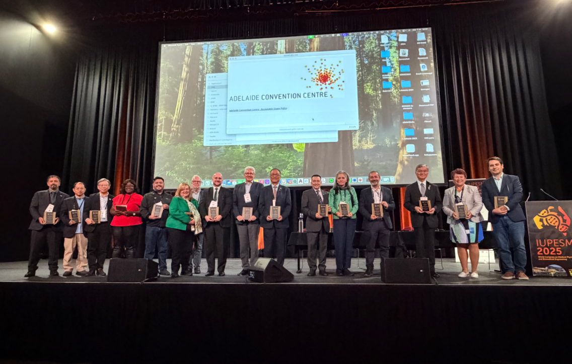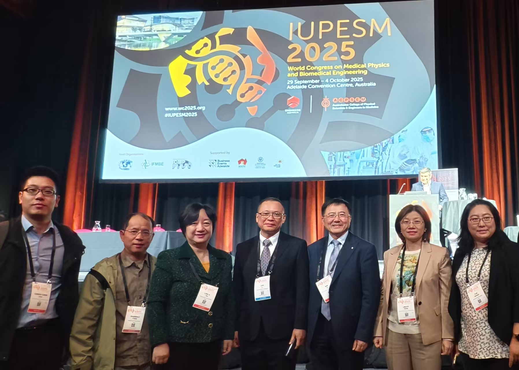 2025年9月29日至10月4日,每三年一届的2025世界医学物理和生物医学工程大会(IUPESM 2025)在澳大利亚阿德莱德市会议中心盛大举行。来自全球80多个国家一千多名医学物理与生物医学工程领域的专家学者、学生、以及产业界代表齐聚一堂,共话行业前沿动态与未来发展方向。上海交通大学致远学院院长、磁共振诊疗高端技术国家工程研究中心主任、中国生物医学工程学会常务理事、六合宝典 讲席教授徐学敏,上海交通大学主动健康战略与发展研究院副院长、上海交通大学附属第六人民医院临港院区原副院长、中国生物医学工程学会理事李斌,六合宝典 教师童善保、隋晓红、娄越及多位研究生一行组成的代表团,凭借多项奖项以及在国际医学与生物学联合会(IFMBE)中的突出贡献,彰显了上海交大在医学工程领域卓越的人才培养能力以及学科的国际影响力。