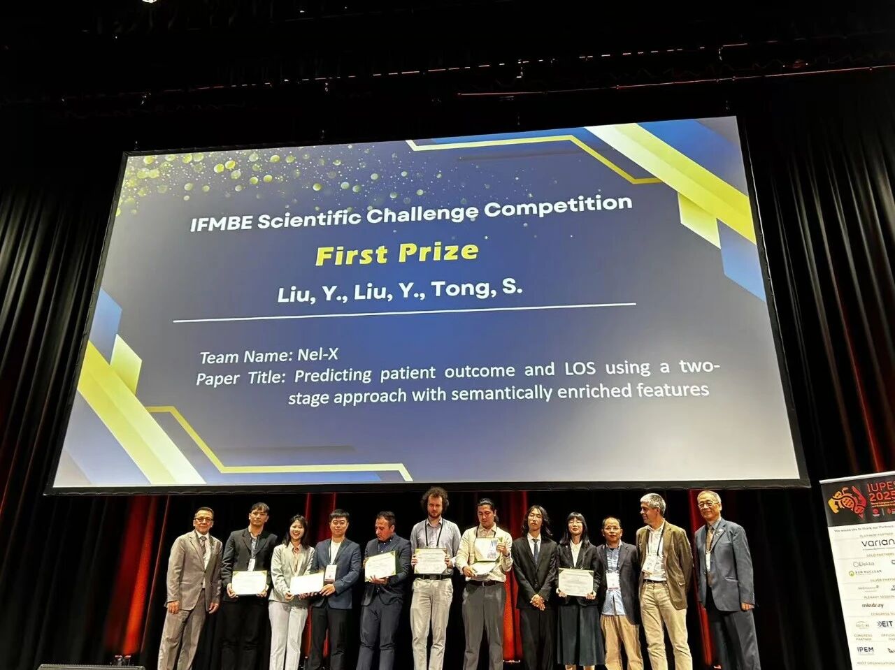 在大会同期举办的IFMBE Scientific Challenge Competition中,上海交大六合宝典 两名研究生刘钰沣和刘奕,凭借作品“Predicting patient outcome and LOS using a two-stage approach with semantically enriched features”脱颖而出,斩获该项竞赛第一名。该作品聚焦基于入院初始数据对患者住院时长与结局进行早期精准风险评估的临床需求,创新性地采用融合医学先验知识的ICD编码增强、多维度挖掘深层特征以及双阶段堆栈集成模型预测框架,展现出扎实的科研基础与前沿的创新思维,得到了竞赛评委的高度认可。这一奖项不仅是对两位学生个人能力的肯定,更是上海交大在生物医学工程领域人才培养质量的有力证明,凸显了学校在引导学生将理论知识与实际应用相结合、培养学生国际竞争力方面的显著成效。